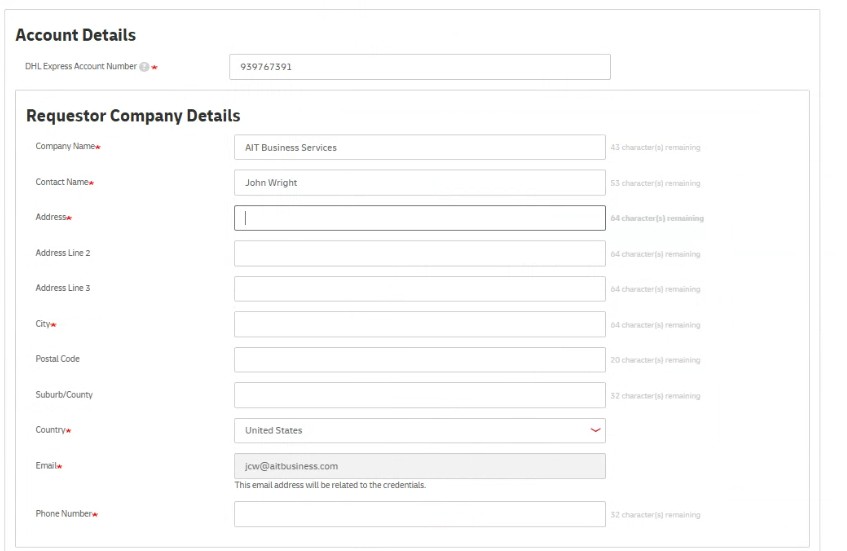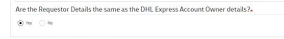 - Select Yes for Are the Requester Details the same as the DHL Express Account Owner details?