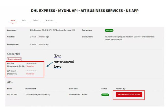 - On the View tab the test environment API Key and API Secret Key are displayed. To obtain a Production key click Request Production Access.