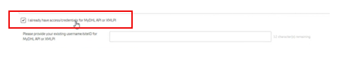- Select I already have access/credentials for MyDHL API or XMLPl and specify your username for MyDHL API or XMLPI.