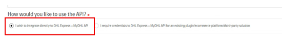 - Select I wish to integrate directly to DHL Express – MyDHL API for How would you like to use the API?