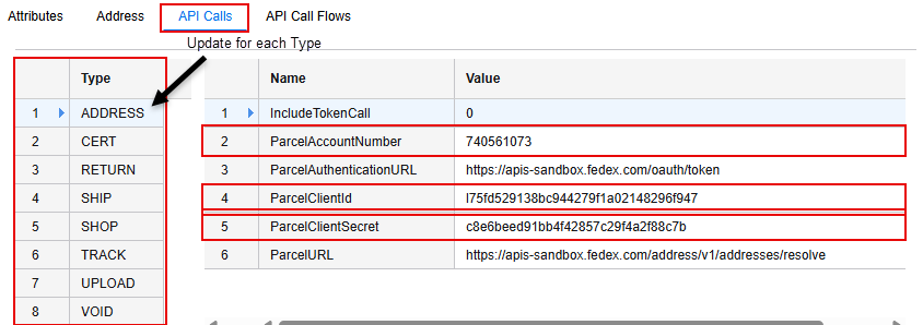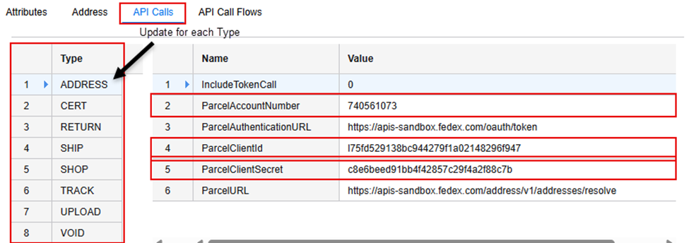 3. On the API Calls tab for each API Type, override any values that reference "AccountNumber", "ClientId", and "ClientSecret" with your company's Test information received when creating your Test credentials.