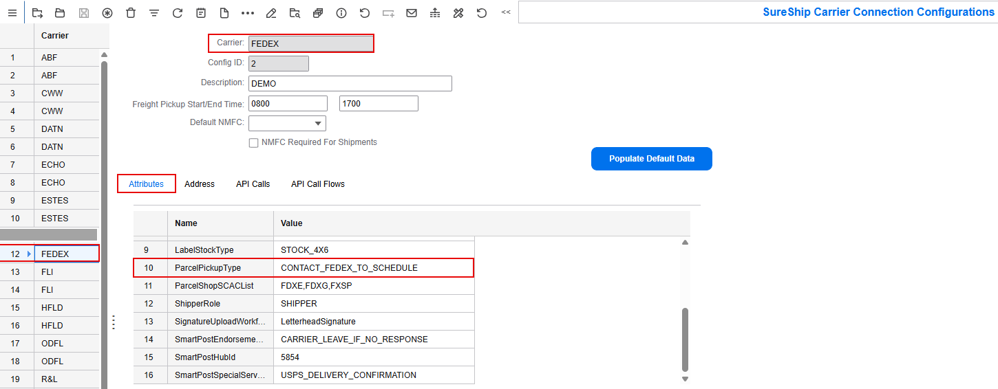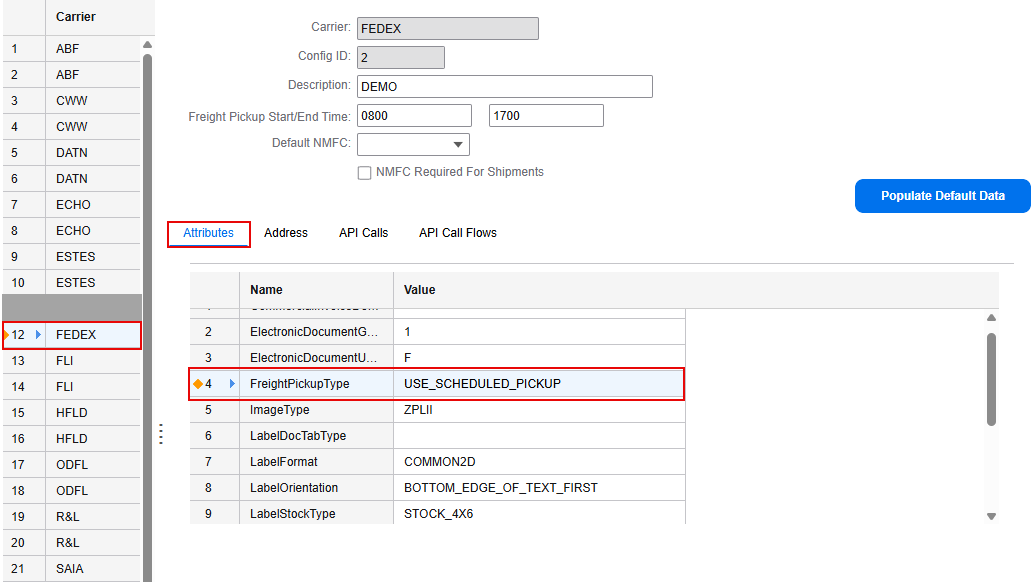 - Select the Attributes tab and specify the following for FreightPickupType: