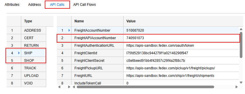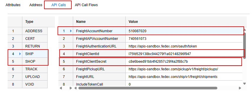 - On the API Calls tab for both API SHIP and SHOP Type, override any values that reference "FreightAccountNumber", "FreightClientId", and "FreightClientSecret" with the freight information you generated for Test Keys.