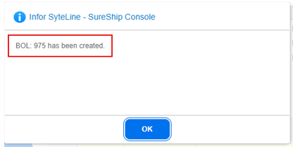 7. A BOL number will automatically be generated with the message below displayed.