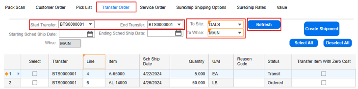 - Open the SureShip Transfer Orders form.