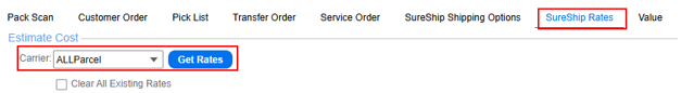 - Once all items are packed, select the SureShip Rates tab to rate shop your preferred carrier. Select ALLParcel to see carrier options available and then select Get Rates.