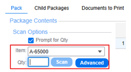 4. Select the Prompt for Qty check box, Item to be placed into the package and specify the Qty to be packed.