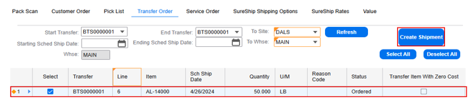 Creating BOLs against Transfer Order Lines using the SureShip Console