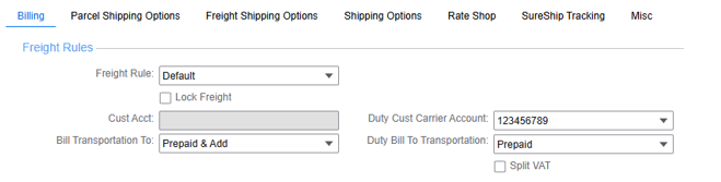 - Select the Billing tab: The billing tab is used to set the freight billing terms, select account information and select shipping parties used for international or third-party shipments.