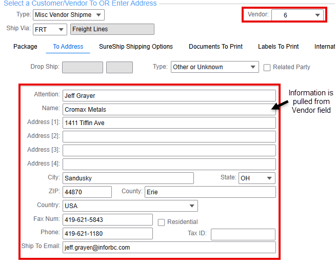 - Misc Vendor Shipment: Select this option to send an item to a specific vendor and select Vendor to borrow from a vendor address.