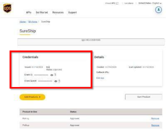 Your Client ID and Client Secret will be displayed. Keep this information in your files. This is the information that will be entered into your SureShip UPS Connection Configuration screen.