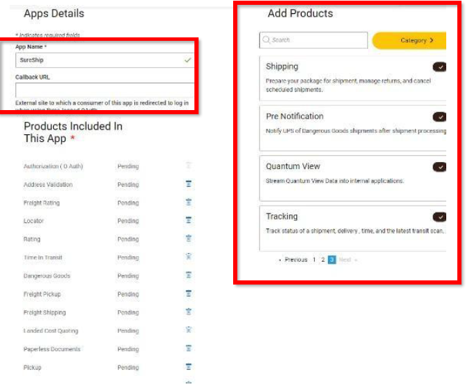 8. Fill in App Name as SureShip and leave Call Back URL blank. Products Included in this App: Select all options on the right side. There are FOUR pages to click through. Please click each option except UPS Tracking Alert and Delivery Confirmation. The website may tell you there are other options that they charge a fee for. Uncheck these items if not needed.