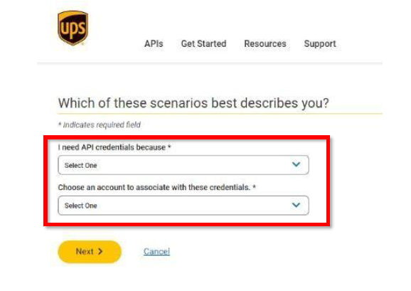 6. Select "I want to integrate UPS technology into my business." Select your account number associated with this account. Click Next.